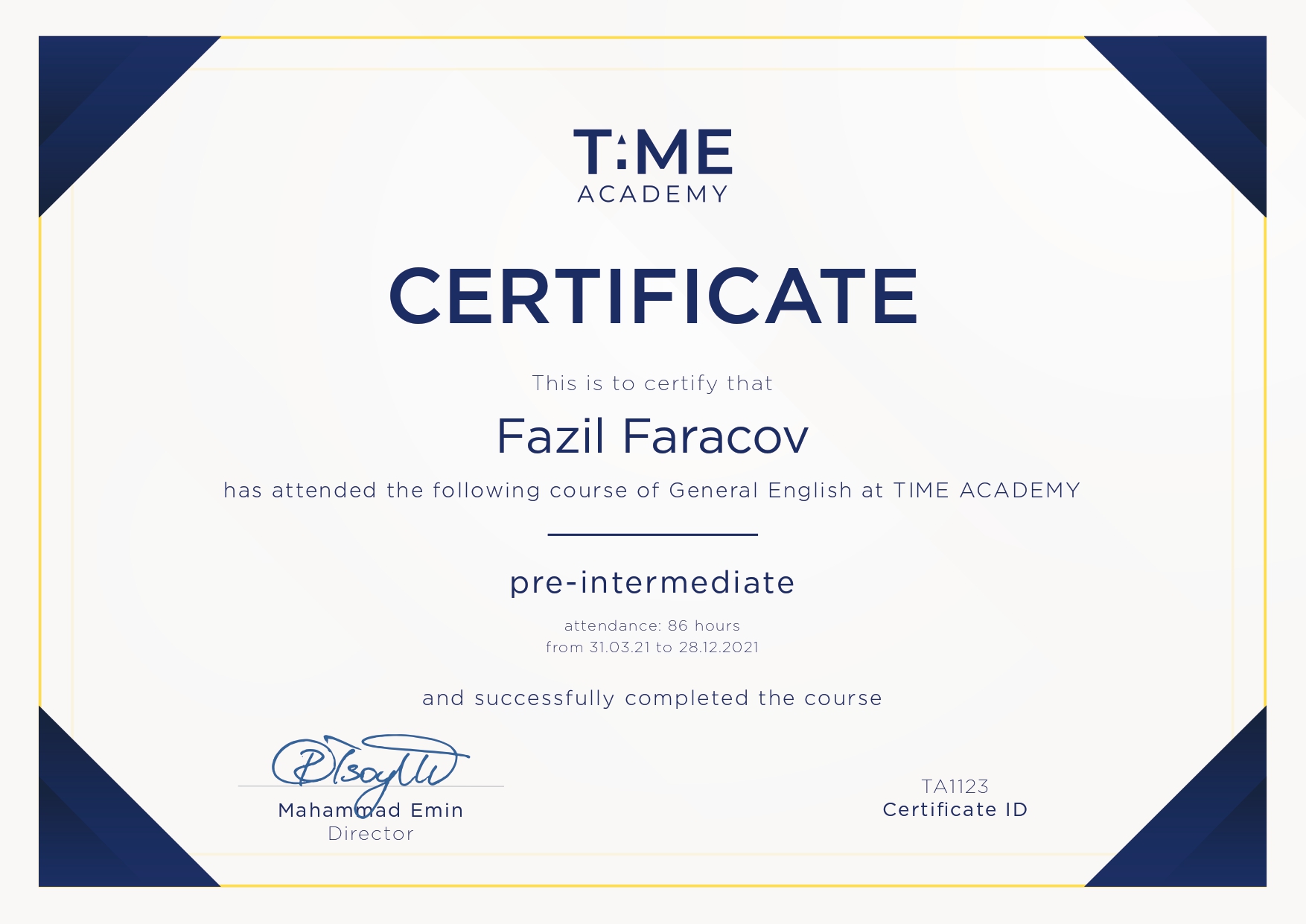 has attended the course of General English at TIME ACADEMY and completed the following level(s):