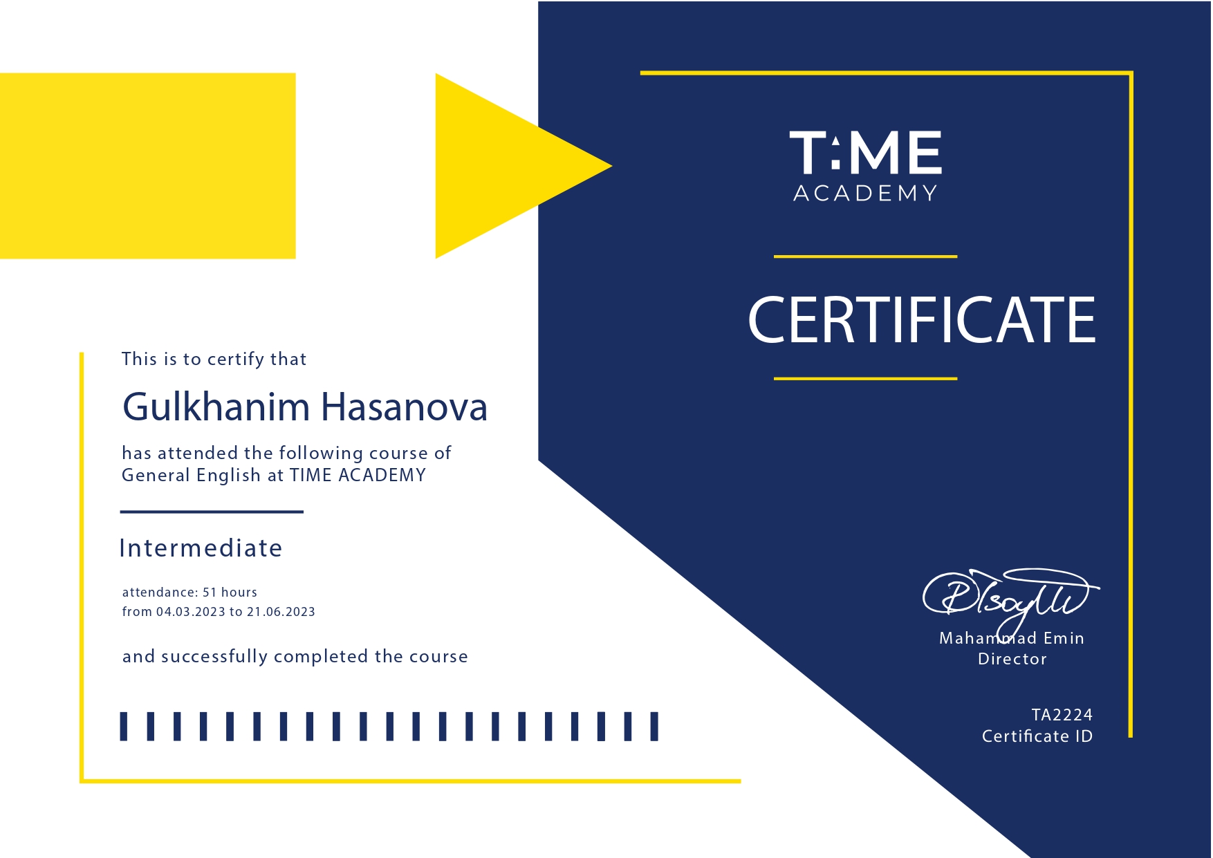 has attended the course of General English at TIME ACADEMY and completed the following level(s):