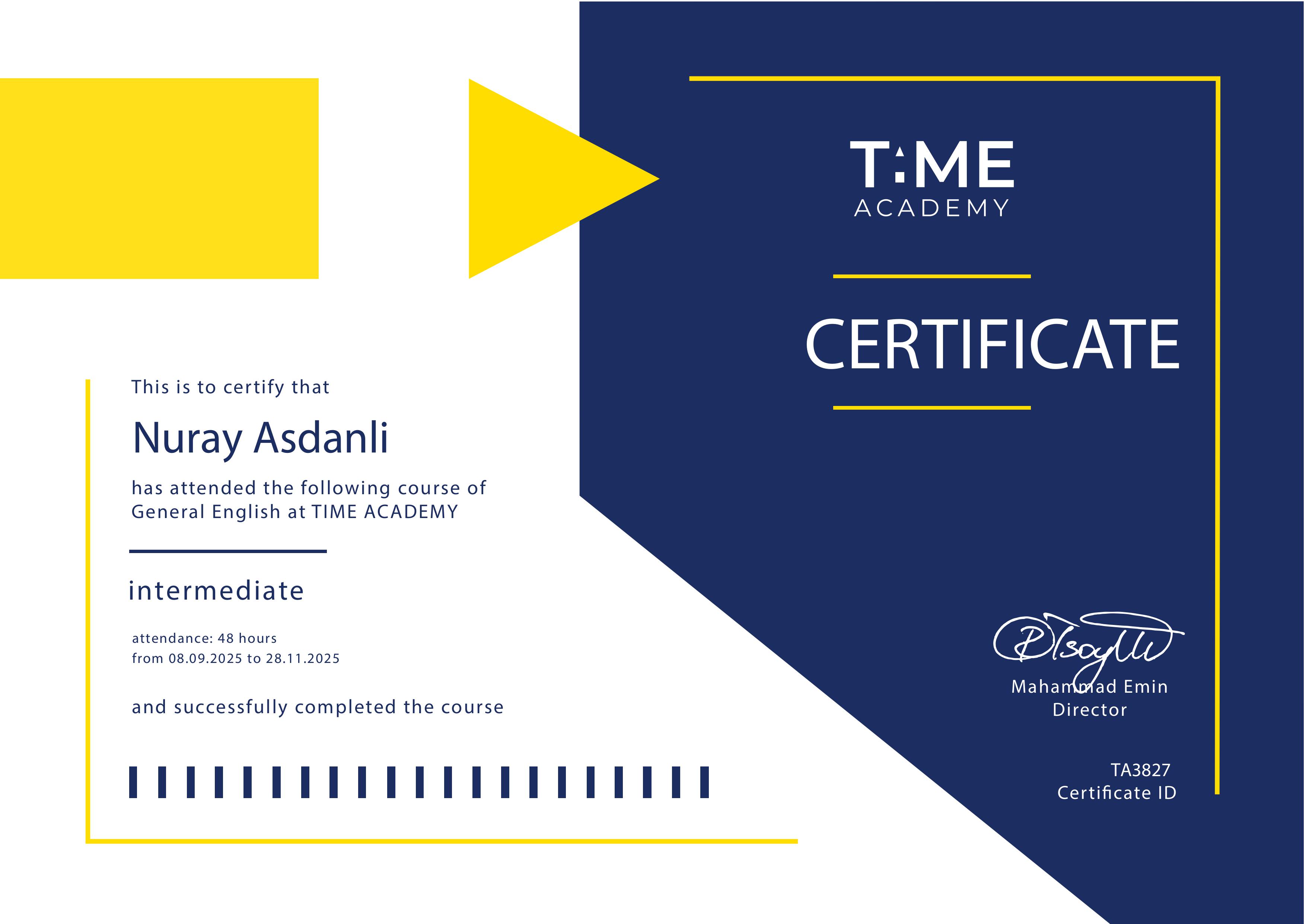 has attended the course of General English at TIME ACADEMY and completed the following level(s):